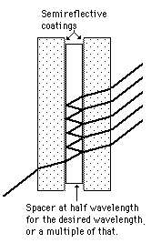 If a thin transparent spacer is placed between two semireflective coatings, multiple reflections and interference can be used to select a narrow frequency band, producing an interference filter. If the spacer is a half wavelength for the desired wavelength, then other wavelengths will be attenuated by destructive interference. Commercial filters are available with a half-power width of about an angstrom. If the back layer is totally reflective, then the arrangement is called a dichroic mirror, reflecting only the selected wavelength. These devices are designed for normal incidence, and shift in wavelength to shorter wavelengths if