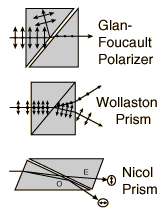 Prisms for PolarizationA number of polarizing prisms have been devised which make use of birefringence to separate two beams in a crystalline material. Often they make use of total internal reflection.