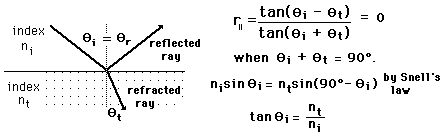 Polarization by ReflectionSince the reflection coefficient for light which has electric field parallel to the plane of incidence goes to zero at some angle between 0° and 90°, the reflected light at that angle is linearly polarized with its electric field vectors perpendicular to the plane of incidence and parallel to the plane of the surface from which it is reflecting. The angle at which this occurs is called the polarizing angle or the Brewster angle. At other angles the reflected light is partially polarized. From Fresnel's equations it can be determined that the parallel reflection coefficient is zero when the incident and transmitted angles sum to 90°. The use of Snell's law gives an expression for the Brewster angle. ![]()