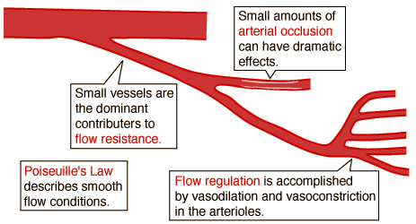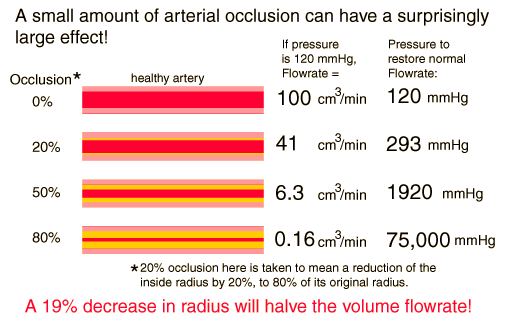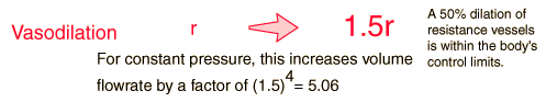 Blood Flow ExamplesSuppose you have an emergency requirement for a five-fold increase in blood volume flowrate (like being chased by a big dog)? How does your body supply it? According to Poiseuille's law, a five-fold increase in blood pressure would be required if the increase were supplied by blood pressure alone! ![]() But the body has a much more potent method for increasing volume flowrate in the vasodilation of the small vessels called arterioles. ![]() Since the smaller vessels provide most of the resistance to flow, the arterioles in their position just prior to the capillaries can provide a major controlling influence on the volume flowrate. This system of small vessels can constrict flow to one part of the body while enhancing the flow to another to meet changing demands for oxygen and nutrients. Calculation of effects of vasodilation or vasoconstriction |