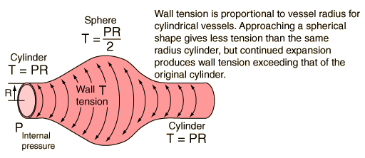 Danger of AneurysmsThe larger arteries of the body are subject to higher wall tensions than the smaller arteries and capillaries. This wall tension follows the dictates of LaPlace's law, a geometrical relationship which shows that the wall tension is proportional to the radius for a given blood pressure. If an artery wall develops a weak spot and expands as a result, it might seem that the expansion would provide some relief, but in fact the opposite is true. In a classic "vicious cycle", the expansion subjects the weakened wall to even more tension. The weakened vessel may continue to expand in what is called an aneurysm. Unchecked, this condition will lead to rupture of the vessel, so aneurysms require prompt medical attention. A localized weak spot in an artery might gain some temporary tension relief by expanding toward a spherical shape, since a spherical membrane has half the wall tension for a given radius. Minimizing membrane tension is why soap bubbles tend to form a spherical shape. But for an expanding artery, forming a near-spherical shape cannot be depended upon to give sufficient tension relief. ![]()
