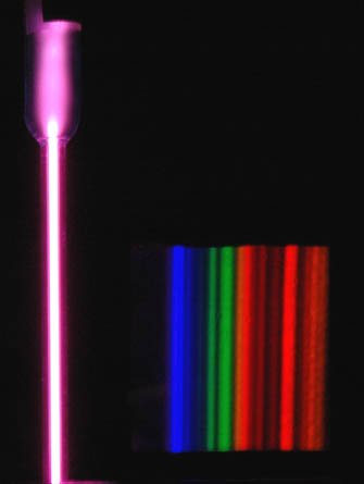 At left above is the spectral tube, excited by a 5000 volt transformer. At right is the spectrum seen through a 600 lines/mm diffraction grating. |