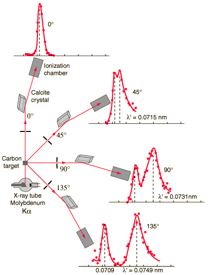 Compton's original experiment made use of molybdenum K-alpha x-rays, which have a wavelength of 0.0709 nm. These were scattered from a block of carbon and observed at different angles with a Bragg spectrometer. The spectrometer consists of a rotating framework with a calcite crystal to diffract the x-rays and an ionization chamber for detection of the x-rays. Since the spacing of the crystal planes in calcite is known, the angle of diffraction gives an accurate measure of the wavelength.