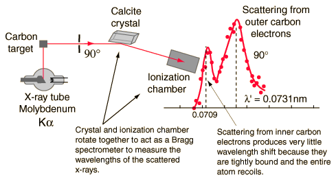 Examination of the Compton scattering formula shows that the scattered wavelength depends upon the angle of scattering and also the mass of the scatterer. For scattering from stationary electrons, the formula gives a wavelength of 0.0733 nm for scattering at 90 degrees. That is consistent with the right-hand peak in the illustration above. The peak which is near the original x-ray wavelength is considered to be scattering off inner electrons in the carbon atoms which are more tightly bound to the carbon nucleus. This causes the entire atom to recoil from the x-ray photon, and the larger effective scattering mass proportionally reduces the wavelength shift of the scattered photons. Putting the entire carbon nuclear mass into the scattering equation yields a wavelength shift almost 22,000 times smaller than that for an unbound electron, so those scattered photons are not seen to be shifted.