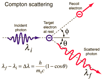 The scattering of photons from charged particles is called Compton scattering after Arthur Compton who was the first to measure photon-electron scattering in 1922. When the incoming photon gives part of its energy to the electron, then the scattered photon has lower energy and according to the Planck relationship has lower frequency and longer wavelength. The wavelength change in such scattering depends only upon the angle of scattering for a given target particle. The constant in the Compton formula above can be written