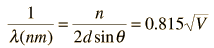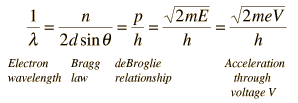 The electron beam was directed at the nickel target, which could be rotated to observe angular dependence of the scattered electrons. Their electron detector (called a Faraday box) was mounted on an arc so that it could be rotated to observe electrons at different angles. It was a great surprise to them to find that at certain angles there was a peak in the intensity of the scattered electron beam. This peak indicated wave behavior for the electrons, and could be interpreted by the Bragg law to give values for the lattice spacing in the nickel crystal. The experimental data above, reproduced above Davisson's article, shows repeated peaks of scattered electron intensity with increasing accelerating voltage. This data was collected at a fixed scattering angle. Using the Bragg law, the deBroglie wavelength expression, and the kinetic energy of the accelerated electrons gives the relationship ![]() In the historical data, an accelerating voltage of 54 volts gave a definite peak at a scattering angle of 50°. The angle theta in the Bragg law corresponding to that scattering angle is 65°, and for that angle the calculated lattice spacing is 0.092 nm. For that lattice spacing and scattering angle, the relationship for wavelength as a function of voltage is empirically ![]() Trying this relationship for n=1,2,3 gives values for the square root of voltage 7.36, 14.7 and 22, which appear to agree with the first, third and fifth peaks above. Then what gives the second, fourth and sixth peaks? Perhaps they originate from a different set of planes in the crystal. Those peaks satisfy a sequence 2,3,4, suggesting that the first peak of that series would have been at 5.85 . That corresponds to an electron wavelength of 0.21 nm and a lattice spacing of 0.116 nm ?? I don't know if that makes sense. I need to look at the original article.