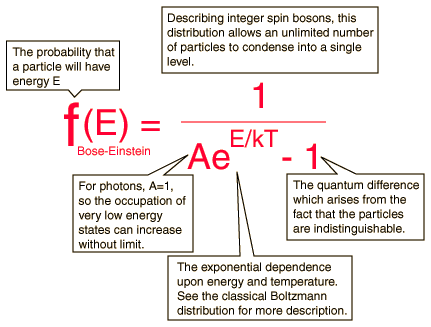 The Bose-Einstein DistributionThe Bose-Einstein distribution describes the statistical behavior of integer spin particles (bosons). At low temperatures, bosons can behave very differently than fermions because an unlimited number of them can collect into the same energy state, a phenomenon called "condensation". ![]()