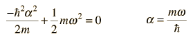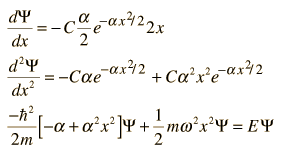 Quantum Harmonic Oscillator: Ground State SolutionTo find the ground state solution of the Schrodinger equation for the quantum harmonic oscillator ![]() we try the following form for the wavefunction ![]() Substituting this function into the Schrodinger equation by evaluating the second derivative gives ![]() For this to be a solution to the Schrodinger equation for all values of x, the coefficients of each power of x must be equal. That gives us a method for fitting the boundary conditions in the differential equation. Setting the coefficients of the square of x equal to each other: ![]() Then setting the constant terms equal gives the energy