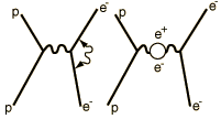 | At the heart of the process is the exchange force by which charges interact by the exchange of photons (the exchange force model of the electromagnetic force). There can be a self interaction of the electron by exchange of a photon as sketched in the Feynman diagram at left. This "smears out" the electron position over a range of about 0.1 fermi (Bohr radius = 52,900 fermis). This causes the electron spin g-factor to be slightly different from 2. There is also a slight weakening of the force on the electron when it is very close to the nucleus, causing the 2s electron (which has penetration all the way to the nucleus) to be slightly higher in energy than the 2p(1/2) electron. |