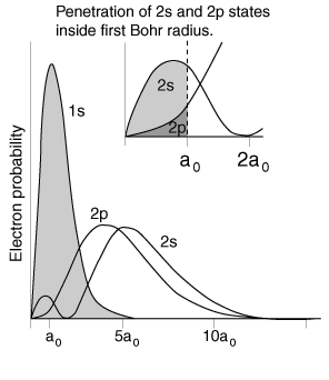 The illustration above uses the hydrogen wavefunctions, which are not exactly correct for lithium but can be used to obtain a qualitative understanding of the dependence of the electron energies on the orbital quantum number. If there were no shielding of the 2s electron, it would be exposed to the entire nuclear charge and have energy -30.6 eV. Modeling this situation by dividing the electron's time between perfect shielding and no shielding, the percentage of time inside the shielding is calculated to be about 6% for the 2s electron. The same model for the 2p electron suggests only about 0.5% of its time inside the shielding.