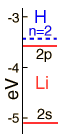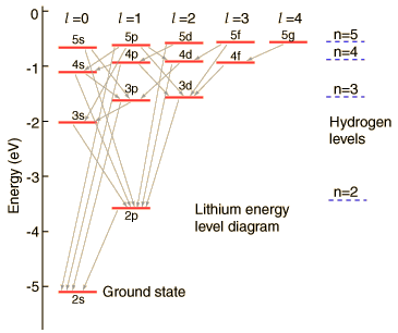 | The lithium 2s level is significantly lower than the 2p because of greater penetration past the shielding of the 1s electron. Both levels penetrate enough to be significantly lower than the n=2 hydrogen energy which they would have if the shielding were perfect. |  |