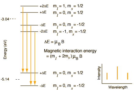 For ![]() The following is a model of the changes in the pattern if the magnetic field were strong enough to decouple L and S. The resulting spectrum would be a triplet with the center line twice the intensity of the outer lines. ![]() To create this pattern, the projections of L and S in the z-direction have been treated independently and the ms multiplied by the spin g-factor. The energy shift is expressed as a multiple of the Bohr magneton mB. The selection rules explain why the transitions shown are allowed and others not.