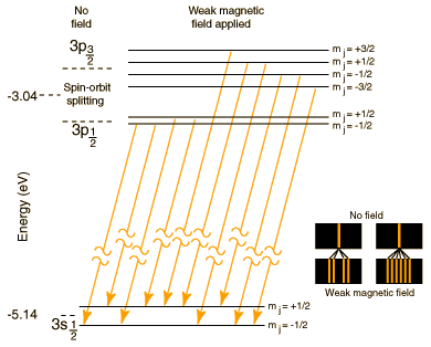 Sodium was used as the basis of the model for convenience, but the fields required to create Paschen-Back conditions for sodium are unrealistically high. Lithium, on the other hand, has a spin-orbit splitting of only 0.00004 eV compared to 0.0021 eV for sodium. Such small energy values are sometimes expressed in "wavenumbers", or 1/l in cm-1. In these units the lithium separation is about 0.3 cm-1and the sodium separation is about 17 cm-1 .The Paschen-Back conditions are met in some lithium spectra observed on the Sun, so this effect does have astronomical significance. |