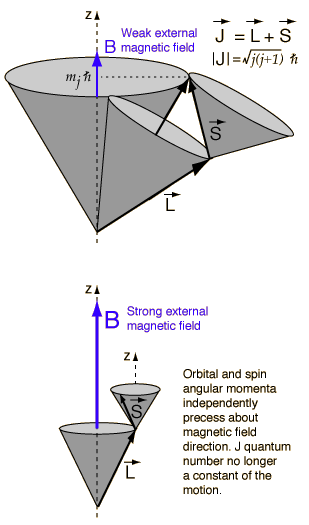 Paschen-Back EffectIn the presense of an external magnetic field, the energy levels of atoms are split. This splitting is described well by the Zeeman effect if the splitting is small compared to the energy difference between the unperturbed levels, i.e., for sufficiently weak magnetic fields. This can be visualized with the help of a vector model of total angular momentum. If the magnetic field is large enough, it disrupts the coupling between the orbital and spin angular momenta, resulting in a different pattern of splitting. This effect is called the Paschen-Back effect.