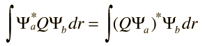 Hermitian Property PostulateThe quantum mechanical operator Q associated with a measurable propertu q must be Hermitian. Mathematically this property is defined by ![]() where ya and yb are arbitrary normalizable functions and the integration is over all of space. Physically, the Hermitian property is necessary in order for the measured values (eigenvalues) to be constrained to real numbers. |