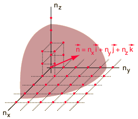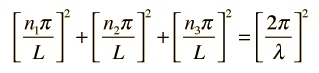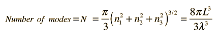 This has a couple of problems, however. In using a sphere, we have used both positive and negative values of n, whereas the wave equation solution uses only positive definite values. Therefore we must take 1/8 th of the volume above. Another technical problem is that you can have waves polarized in two perpendicular planes, so we must multiply by two to account for that. Then the volume can be taken to be a measure of the number of modes, becoming a very good approximation when the size of the cavity is much greater than the wavelength as in the case of electromagnetic waves in finite cavity. Using the relation obtained for the values of n, this becomes ![]()