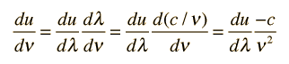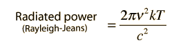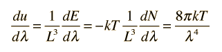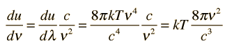 How much energy per unit volume?Assigning energy to the electromagnetic standing waves in a cavity draws on the principle of equipartition of energy. Each standing wave mode will have average energy kT where k is Boltzmann's constant and T the temperature in Kelvins. Letting u represent the energy density: ![]() This is an important relationship in classical electromagnetic cavity theory. It can also be expressed in terms of the frequency ν by making use of the chain rule and the wave relationship: ![]() The minus sign here just reminds us that a decrease with wavelength implies an increase with increasing frequency. The magnitude of the energy density dependence on frequency is given by: ![]() Note that this is the classical result which was used in the Rayleigh-Jeans Law, but led to the ultraviolet catastrophe. It produces good agreement in the low frequency limit, but for higher frequencies the Planck radiation formula must be used.