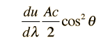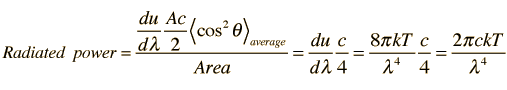 Radiated Energy as a Function of WavelengthIf we consider energy radiated perpendicular to a small increment of area, then it must be noted that half of the energy density in the waves is going toward the walls and half is coming out if the system is in thermal equilibrium. Evaluating the power seen at a given observation point requires a consideration of the geometry: For perpendicular radiated energy![]() but at an angle θ, the effective area will be Acosθ and the effective speed will be c cosθ, so the radiated energy will be reduced to ![]() For a given observation point near a radiating surface, the power will be the average power from all directions, and the average gives another factor of 1/2. Having averaged over all angles, the calculated radiated power per unit wavelength is finally ![]()