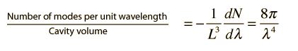 How many modes per unit wavelength?Having developed an expression for the number of standing wave modes in a cavity, we would like to know the distribution with wavelength. This may be obtained by taking the derivative of the number of modes with respect to wavelength. ![]() The negative sign here reveals that the number of modes decreases with increasing wavelength. Now to get the number of modes per unit volume per unit wavelength, we can simply divide by the volume of the cubical cavity. ![]() Note that this does not involve approximating a sphere with a cube! The sphere we used in calculating the number of modes was a sphere in "n-space", allowing us to count the number of possible modes. Also, the use of a cubical cavity for the calculation just allows us to reduce the geometrical complexity of the development, but the final result obtained is independent of cavity geometry.
