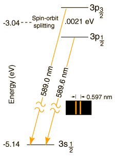 The Sodium Zeeman EffectThe sodium spectrum is dominated by the bright doublet known as the Sodium D-lines at 588.9950 and 589.5924 nanometers. From the energy level diagram it can be seen that these lines are emitted in a transition from the 3p to the 3s levels.