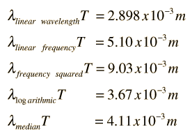 Wien's Displacement Law and Other Ways to Characterize the Peak of Blackbody RadiationWhen the temperature of a blackbody radiator increases, the overall radiated energy increases and the peak of the radiation curve moves to shorter wavelengths. When the maximum is evaluated from the Planck radiation formula, the product of the peak wavelength and the temperature is found to be a constant.![]() ![]() This relationship is called Wien's displacement law and is useful for the determining the temperatures of hot radiant objects such as stars, and indeed for a determination of the temperature of any radiant object whose temperature is far above that of its surroundings. The temperature can be found from the wavelength at which the radiation curve peaks. It should be noted that the peak of the radiation curve in the Wien relationship is the peak only because the intensity is plotted as a function of wavelength. If frequency or some other variable is used on the horizontal axis, the peak will be at a different wavelength. There are various rationales for using the alternate ways of plotting the blackbody radiation curve, as discussed by Heald. The process of finding the maximum in a given presentation is to set the derivative of the intensity equal to zero and then numerically solve the transcendental equation that results. The solutions for the processes included above are summarized below.