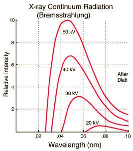 Characteristic x-rays are emitted from heavy elements when their electrons make transitions between the lower atomic energy levels. The characteristic x-rays emission which shown as two sharp peaks in the illustration at left occur when vacancies are produced in the n=1 or K-shell of the atom and electrons drop down from above to fill the gap. The x-rays produced by transitions from the n=2 to n=1 levels are called K-alpha x-rays, and those for the n=3->1 transiton are called K-beta x-rays.
