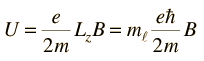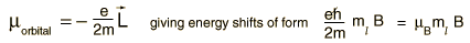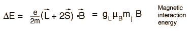 Zeeman InteractionAn external magnetic field will exert a torque on a magnetic dipole and the magnetic potential energy which results is ![]() The magnetic dipole moment associated with the orbital angular momentum is given by ![]() For magnetic field in the z-direction this gives ![]() Considering the quantization of angular momentum , this gives equally spaced energy levels displaced from the zero field level by ![]() ![]() This displacement of the energy levels gives the uniformly spaced multiplet splitting of the spectral lines which is called the Zeeman effect. The magnetic field also interacts with the electron spin magnetic moment, so it contributes to the Zeeman effect in many cases. The electron spin had not been discovered at the time of Zeeman's original experiments, so the cases where it contributed were considered to be anomalous. The term "anomalous Zeeman effect" has persisted for the cases where spin contributes. In general, both orbital and spin moments are involved, and the Zeeman interaction takes the form ![]() The factor of two multiplying the electron spin angular momentum comes from the fact that it is twice as effective in producing magnetic moment. This factor is called the spin g-factor or gyromagnetic ratio. The evaluation of the scalar product between the angular momenta and the magnetic field here is complicated by the fact that the S and L vectors are both precessing around the magnetic field and are not in general in the same direction. The persistent early spectroscopists worked out a way to calculate the effect of the directions. The resulting geometric factor gL in the final expression above is called the Lande g factor. It allowed them to express the resultant splittings of the spectral lines in terms of the z-component of the total angular momentum, mj. The above treatment of the Zeeman effect describes the phenomenon when the magnetic fields are small enough that the orbital and spin angular momenta can be considered to be coupled. For extremely strong magnetic fields this coupling is broken and another approach must be taken. The strong field effect is called the Paschen-Back effect. |