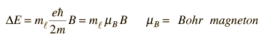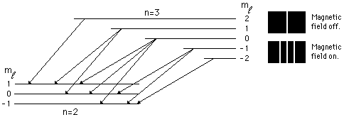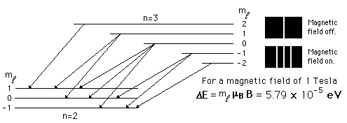 Zeeman Effect in HydrogenWhen an external magnetic field is applied, sharp spectral lines like the n=3→ 2 transition of hydrogen split into multiple closely spaced lines. First observed by Pieter Zeeman, this splitting is attributed to the interaction between the magnetic field and the magnetic dipole moment associated with the orbital angular momentum. In the absence of the magnetic field, the hydrogen energies depend only upon the principal quantum number n, and the emissions occur at a single wavelength.![]() Note that the transitions shown follow the selection rule which does not allow a change of more than one unit in the quantum number ml.