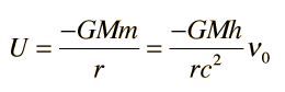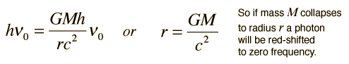 Escape Energy for PhotonIf the gravitational potential energy of the photon is exactly equal to the photon energy then![]() Note that this condition is independent of the frequency, and for a given mass M establishes a critical radius. Actually, Schwarzchilds's calculated gravitational radius differs from this result by a factor of 2 and is coincidently equal to the non-relativistic escape velocity expression ![]()