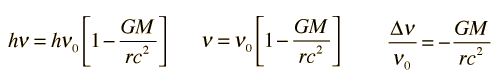 Gravity and the PhotonThe relativistic energy expression attributes a mass to any energetic particle, and for the photon ![]() The gravitational potential energy is then ![]() When the photon escapes the gravity field, it will have a different frequency ![]() Since it is reduced in frequency, this is called the gravitational red shift or the Einstein red shift.