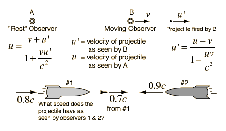 Einstein Velocity AdditionThe relative velocity of any two objects never exceeds the velocity of light. Applying the Lorentz transformation to the velocities, expressions are obtained for the relative velocities as seen by the different observers. They are called the Einstein velocity addition relationships. ![]()