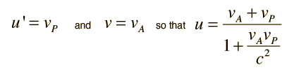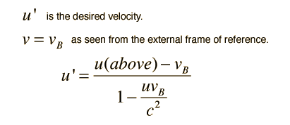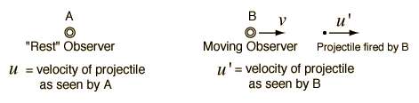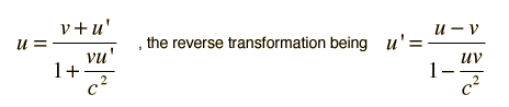 Einstein Velocity AdditionThe Einstein velocity relationship transforms a measured velocity as seen in one inertial frame of ![]() If A sees B moving at velocity v, then a velocity measured by B (u') would be seen by A as: ![]() These relationships make perfect sense at low speeds where both denominators approach 1. |