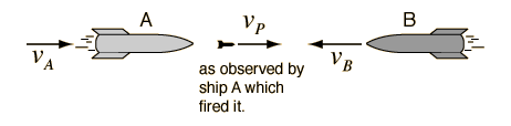 Relativistic ProjectileNow if spacecraft A fires a projectile at velocity Vp as measured in A's frame of 1. How fast will an external observer see the projectile traveling? 2. How fast will B see the projectile approaching? This is an example of Einstein velocity addition. ![]() Taking question #1 first, then in the standard form: ![]() For low speeds, this expression yields a value equal to the sum of the magnitudes of the three velocities as indicated in the diagram. The Einstein velocity addition gaurantees that the resultant velocity does not exceed c, even if all three of the indicated velocities approach c! |