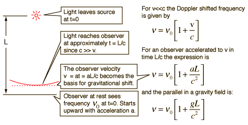 Gravitational Red ShiftAccording to the principle of equivalence from general relativity, any frequency shift which can be shown to arise from acceleration of a radiating source could also be produced by the appropriate gravitational field. Thus the expected shift in radiation frequency in a gravitational field can be related to the relativistic doppler shift experienced from an accelerating light source. ![]() Gravity and the photon