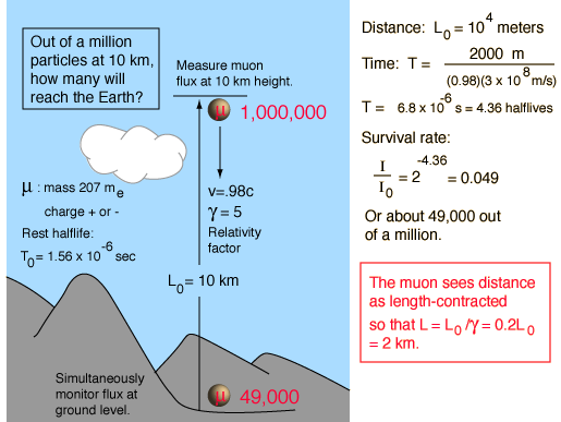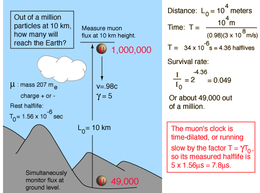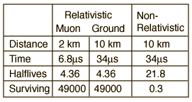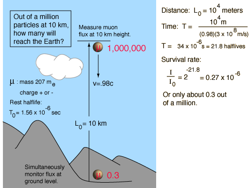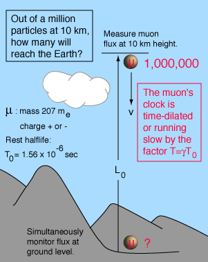Muon ExperimentThe measurement of the flux of muons at the Earth's surface produced an early dilemma because many more are detected than would be expected, based on their short half-life of 1.56 microseconds. This is a good example of the application of relativistic time dilation to explain the increased particle range for high-speed particles. Non-Relativistic![]()