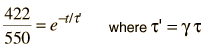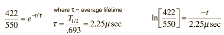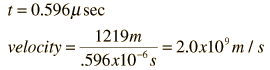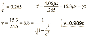 Muon VelocityOn top of a mountain at 6000 ft a muon detector measures a flux of 550 muons per hour. At a laboratory at the base of the mountain at 2000 ft, a simultaneous experiment measures 422 muons/hr. The half-life of the muon is 1.56 microseconds. How fast were the muons traveling? Solution: First we will proceed without regard to relativity and the Lorentz transformation. The distance traveled L=4000 ft x 0.3048 m/ft = 1219 m The time is then calculated for the two populations as an exponential decay process using the half-life measured in the laboratory. ![]() The results of this calculation are: