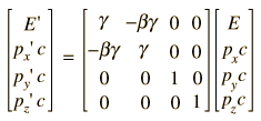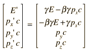 where p*c has been used to represent the value of each momentum since they are constrained to be equal. This expression can be used to determine p*c, and that value can be compared to the original value of the momentum for one of the particles to determine the values of b and g necessary for the transformation.