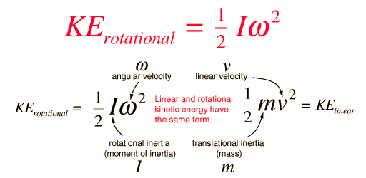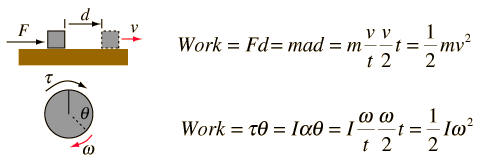 Rotational Kinetic EnergyThe kinetic energy of a rotating object is analogous to linear kinetic energy and can be expressed in terms of the moment of inertia and angular velocity. The total kinetic energy of an extended object can be expressed as the sum of the translational kinetic energy of the center of mass and the rotational kinetic energy about the center of mass. For a given fixed axis of rotation, the rotational kinetic energy can be expressed in the form ![]() The expressions for rotational and linear kinetic energy can be developed in a parallel manner from the work-energy principle. Consider the following parallel between a constant torque exerted on a flywheel with moment of inertia I and a constant force exerted on a mass m, both starting from rest. ![]() For the linear case, starting from rest, the acceleration from Newton's second law is equal to the final velocity divided by the time and the average velocity is half the final velocity, showing that the work done on the block gives it a kinetic energy equal to the work done. For the rotational case, also starting from rest, the rotational work is τθ and the angular acceleration α given to the flywheel is obtained from Newton's second law for rotation. The angular acceleration is equal to the final angular velocity divided by the time and the average angular velocity is equal to half the final angular velocity. It follows that the rotational kinetic energy given to the flywheel is equal to the work done by the torque.