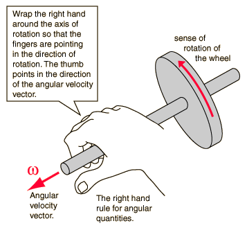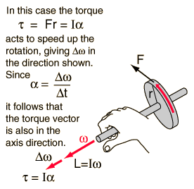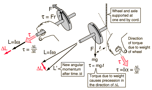 Angular Momentum ChangeA force tangential to the wheel produces a torque along the axis as shown (right hand rule). The change in angular momentum is therefore along the axis and the wheel increases in angular velocity. However, if the torque direction is perpendicular to the axis of the wheel the effect is very different. The change in angular velocity is perpendicular to the angular velocity vector, changing its direction but not its magnitude. The resultant motion of the wheel around a vertical axis is called precession.