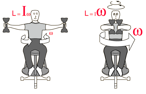 If the wheel is turned over, its angular momentum is now downward. But since there is nothing to exert a significant torque on the system, the angular momentum must have the original value upward. The man and the stool begin to rotate with angular momentum twice that of the wheel.