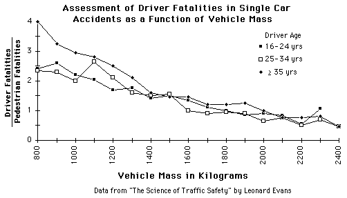 Vehicle Mass and Accidents![]() The more massive vehicle in a two-vehicle collision would be presumed to be safer since it would undergo less change in velocity during the collision. Not so evident is the fact that the more massive car is safer in a single-car accident. Leonard Evans collected data from the FARS database for a Fatality vs Mass comparison. His problem in assessing the rate of incidence of fatal accidents was to have a base for comparison since non-fatal single car accidents are not included in the database, nor are the number of cars in a given mass range. He used the number of pedestrian fatalities as a base, a "surrogate" for the number of serious accidents of all types, since it was presumed that the ratio of collisions with pedestrians to other types of collisions, e.g. with trees, would be similar for any mass class. It was also presumed that the pedestrian fatality rate would be more-or-less independent of car mass since even the lightest car is so much more massive than a pedestrian. The self-consistency of the curves for different ages of driver offers some evidence of validity since their accident rates were much different.