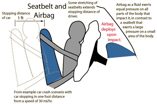 Seatbelt and Airbag for SafetyWhile the driver with an airbag may experience the same average impact force as the driver with a good seatbelt, the airbag exerts an equal pressure on all points in contact with it according to Pascal's principle. The same force is distributed over a larger area, reducing the maximum pressure on the body.
