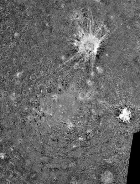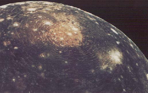 Callisto![]() Callisto is similar in appearance to Ganymede, but with more craters and fewer of the linear fault features. The large series of concentric rings on the image above is named Valhalla. It measures some 3000 km across and is evidence of some cataclysmic impact. It is as if there was an upthrust of partially melted ice, but it refroze before the ripples could subside. The density of craters in Valhalla indicate that it is very old, and there is no evidence of any recent tectonic activity. There is another large basin with similar features, the smaller Asgard imaged below.