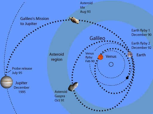 Launched on October 19, 1989, the Galileo spacecraft was designed for a study of Jupiter. Multiple delays in the launch of Galileo required the calculation of a much slower and more circuitous route to Jupiter. This path required gravity-assist or slingshot maneuvers around Venus, twice around Earth and encounters with two asteroids, Gaspra and Ida, on the way to Jupiter.