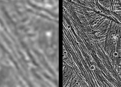 The frame at left was taken by the Voyager 2 spacecraft when it flew by in 1979, with a resolution of about 1.3 kilometers (0.8 mile) per pixel. The frame at right showing the same area was captured by Galileo during its first flyby of Ganymede on June 27, 1996; it has a resolution of about 74 meters (243 feet) per pixel, more than 17 times better than that of the Voyager image. In each of the above frames, north is to the top, and the sun illuminates the surface from the lower left nearly overhead (about 77 degrees above the horizon). The area shown, at latitude 10 degrees north, 167 degrees west, is about 35 by 55 kilometers (25 by 34 miles). The image was taken June 27 when Galileo was 7,448 kilometers (4.628 miles) away from Ganymede.