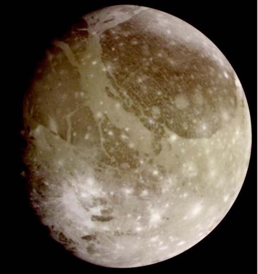 Ganymede![]() This is a natural color view of Ganymede from the Galileo spacecraft during its first encounter with the satellite. North is to the top of the picture and the sun illuminates the surface from the right. The dark areas are the older, more heavily cratered regions and the light areas are younger, tectonically deformed regions. The brownish-gray color is due to mixtures of rocky materials and ice. Bright spots are geologically recent impact craters and their ejecta. The finest details that can be discerned in this picture are about 13.4 kilometers across. The images which combine for this color image were taken beginning on June 26, 1996.
