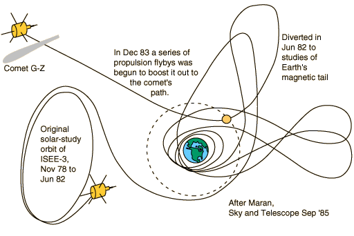 Comet Giacobini-ZinnerMultiple "slingshot" propulsion manuevers place the IEEE-3 spacecraft in position to view Comet Giacobini-Zinner. ![]() The chance to observe newly discovered Comet Giacobini-Zinner transformed an ordinary solar orbit into a dramatic series of slingshot propulsion maneuvers which converted ordinary solar-wind observation satellite ISEE-3 into "International Cometary Explorer". From an undramatic history, ICE became prominent as it was steered through 37 propulsive maneuvers,five lunar flybys, and two close passes of the Earth during an eighteen month period to send it out to intercept the orbit of Comet G-Z. Its path brought it within 120 km of the moon's surface on one pass. It reached Comet G-Z at a distance of about 70 million kilometers from the Earth, passing 8000 kilometers behind the comet's nucleus and spending about 20 minutes passing through its tail. The close encounter enabled measurements of about 70,000 km for the diameter of the coma. The tail was well over 500,000 km. Comet G-Z had a thin, straight primarily ion tail, in contrast to the more commonly observed broad dust tails.