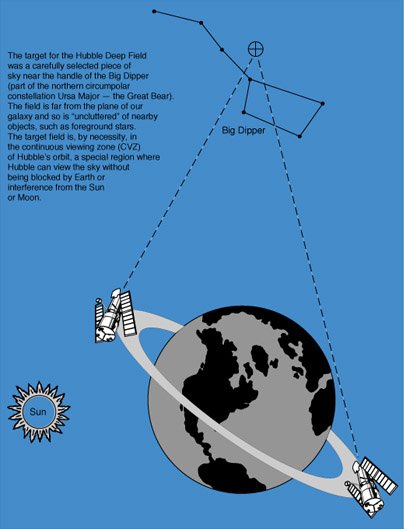 There are many geometries of galaxies including the spiral galaxy characteristic of our own Milky Way. In the remarkable deep space photograph made by the Hubble Space Telescope, every visible object except for the foreground stars is another galaxy. The image is a composite of 342 images taken over a period of 10 days with the Wide Field and Planetary Camera 2 on December 18-28, 1995. With an average exposure on the order of 30 minutes, that amounts to about 170 hours of exposure. NASA compares the field of view with that of a dime at 75 feet. The camera was directed almost perpendicular to the galactic plane to get a field of view as clear of foreground stars as possible. The NASA illustration at left shows the location in the constellation Ursa Major.