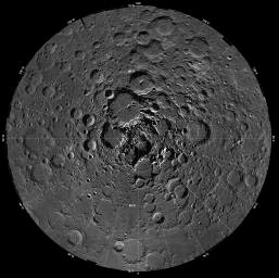 At left above is an image of the South polar region of the Moon constructed from about 1500 Clementine images. The projection is orthographc, centered on the south pole. The Schrodinger Basin (320 km in diameter) is located in the lower right of the mosaic. Amundsen-Ganswindt is the more subdued circular basin between Schrodinger and the pole. The polar regions of the moon are of special interest because of the postulated occurrence of ice in permanently shadowed areas. The south pole is of greater interest because the area that remains in shadow is much larger than that at the north pole. At right above is a similar lunar mosaic of ~1500 Clementine images of the north polar region of the moon. The projection is orthographic centered on the north pole. The north pole of the moon is absent of the very rugged terrain seen at the south pole. These descriptions are excerpted from the original NASA captions released with the images. ![]() This image shows the limb of the Copernicus Impact Crater and was made by Lunar Orbiter II. Its creation date is listed as June 1, 1991. Copernicus is 93 km wide and is located within the Mare Imbrium Basin, northern nearside of the Moon (10 degrees N., 20 degrees W.). The image shows crater floor, floor mounds, rim, and rayed ejecta. Rays from the ejecta are superposed on all other surrounding terrains which places the crater in its namesake age group: the Copernican system, established as the youngest assemblage of rocks on the Moon (Shoemaker and Hackman, 1962, The Moon: London, Academic Press, p.289- 300). (From the original NASA caption released with the image.) ![]() NASA Image from Apollo 8 Spacecraft This rightly-rayed crater on the farside of the moon was photographed by Apollo 8 on December 24, 1968.The imaged area is near the subsolar point, where the sun was directly overhead as seen from the Apollo 8 spacecraft. Brightly-rayed craters are numerous on the lunar frontside; however, they had not been previously observed in such detail on the farside (excerpted from the original NASA caption released with the image.)