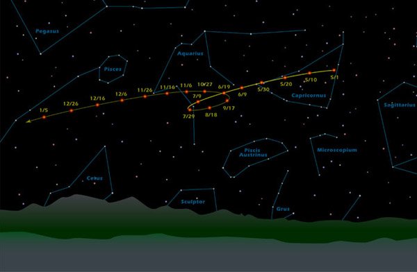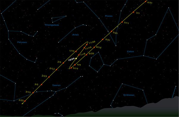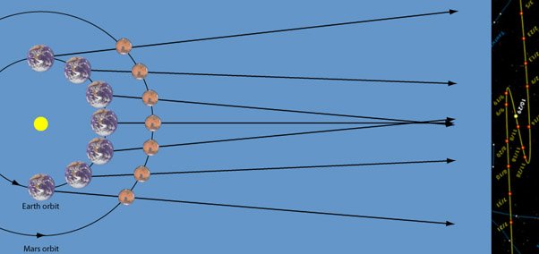 Retrograde Motion of MarsArising from the nature of the orbits of Earth and Mars around the Sun, there are times when Mars appears to be traveling backward for a short time compared to the "fixed stars". Below are NASA/JPL-Caltech illustrations from ![]() Looking up in the sky each night at the same time, you would usually observe that Mars is a little further east each night compared to the constellations. But about every two years there are a couple of months when Mars appears to move from east to west when observed at the same time (retrograde motion). The above is the pattern as observed in 2003. ![]() This is the apparent path of Mars during 2005 when it exhibited retrograde motion over about a two month period. ![]() This backward or retrograde motion was mysterious to the early observers, and led to the use of the word "planet", from the Greek term which means "wanderer". With our current understanding that the Earth travels around the Sun in 1 year while the more distant Mars has a siderial period of 1.88 Earth years, it is clear that the Earth will periodically "catch up" to its more distant neighbor. As the Earth moves forward in its orbit, Mars will appear to slip backward compared to its more common eastward march across the sky. ![]() From one time that the Earth and Mars are on a line through the Sun (called being in "opposition") to the next opposition is 2.135 Earth orbits. It is in a short period including the time of opposition when Mars exhibits its retrograde motion to an observer on the Earth. The time period between oppositions is called the synodic period. |